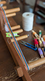 The Schacht inkle loom has one open side for easy warping. Warps can be up to 4.5" wide and 8.5' long--one warp is enough for a pair of shoelaces!
